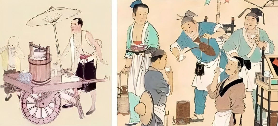 制作冷饮,往往要用到冰,古代没有冰箱,冰从哪里来?冬日取于河中,冬藏夏用。这在《诗经》《左传》等典籍中就有记载。考古发现,商代就有了冰窖。使用冰块时有专门设备,如青铜“冰鉴”、柏木“冰桶”等。它们除了冰镇保鲜食物,也常用来给房间降温。采冰、制冰、运冰、藏冰耗时费力,夏日之冰是珍贵之物,非普通百姓所能享用。直到唐代,在民间出现了私家藏冰以售卖的“冰商”。