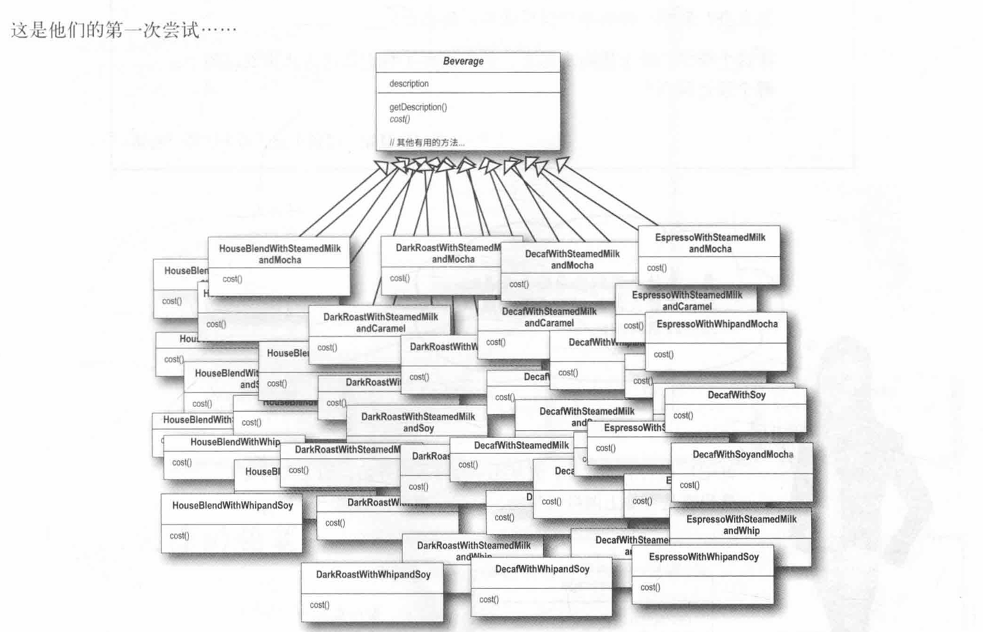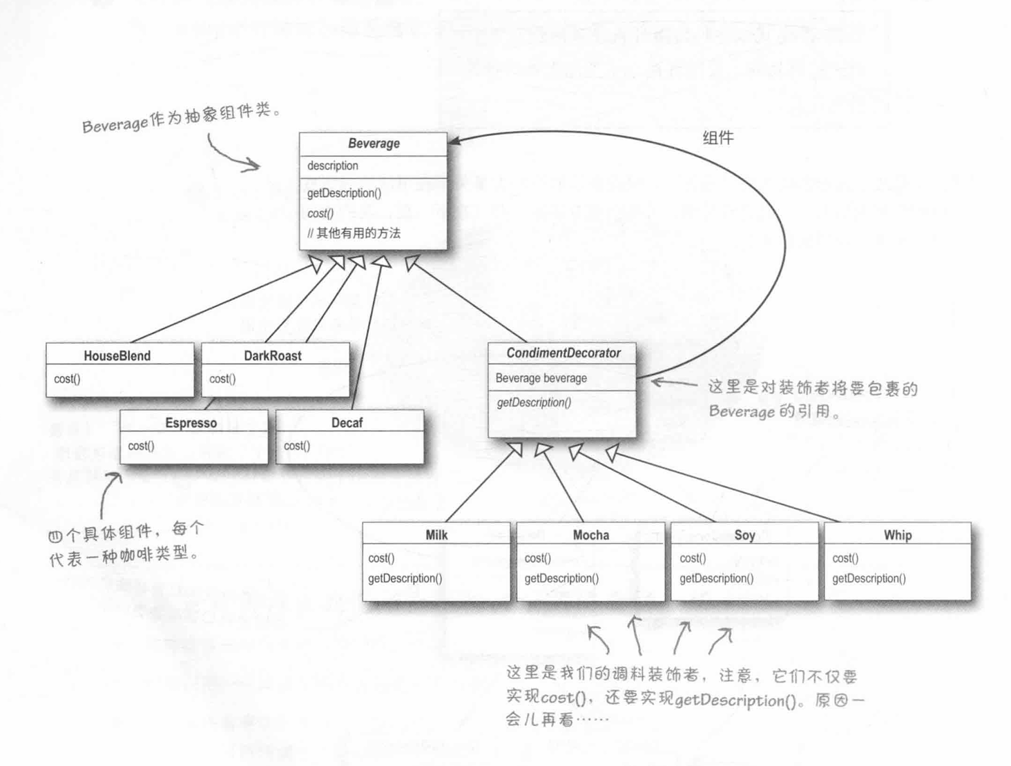 书中以星巴兹咖啡订单系统为例,若用继承方式实现带不同调料的咖啡类,会导致 “类爆炸”,且难以应对调料价格变化、新增调料等情况,不符合 “对扩展开放,对修改关闭” 的设计原则。因此需要一种更灵活的方式来扩展对象功能。