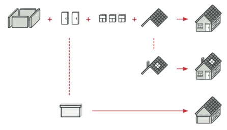 如上图所示,建房子的流程(打地基 → 立框架→装门窗→封屋顶等)是通用的,但细节可以随着房型不同而变化。