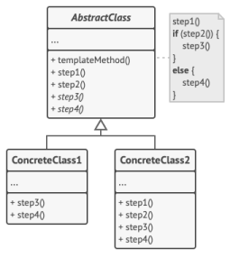 抽象类 会声明作为算法步骤的方法, 以及依次调用它们的实际模板方法。 算法步骤可以被声明为抽象类型, 也可以提供一些默认实现。