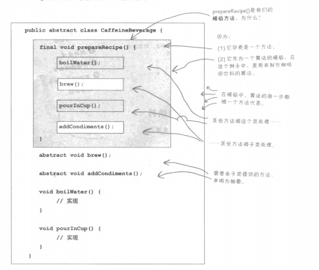 抽象类(CaffeineBeverage):定义模板方法(prepareRecipe()),包含算法的固定步骤(boilWater()、pourInCup())和抽象步骤(brew()、addCondiments())。