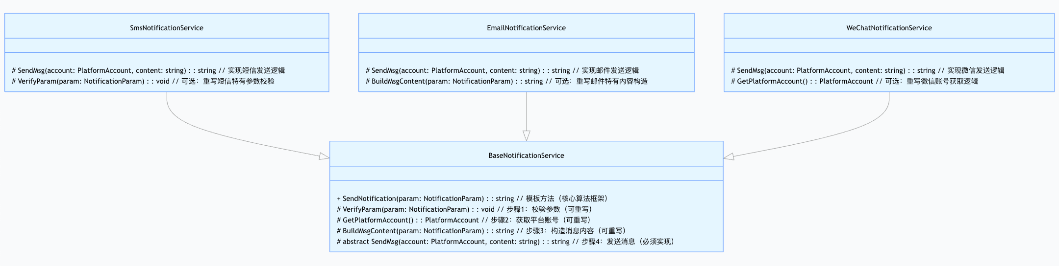 - 核心流程包括校验参数(VerifyParam)、获取平台账号信息(GetPlatformAccount)、构造消息内容(BuildMsgContent)、发送消息(SendMsg)