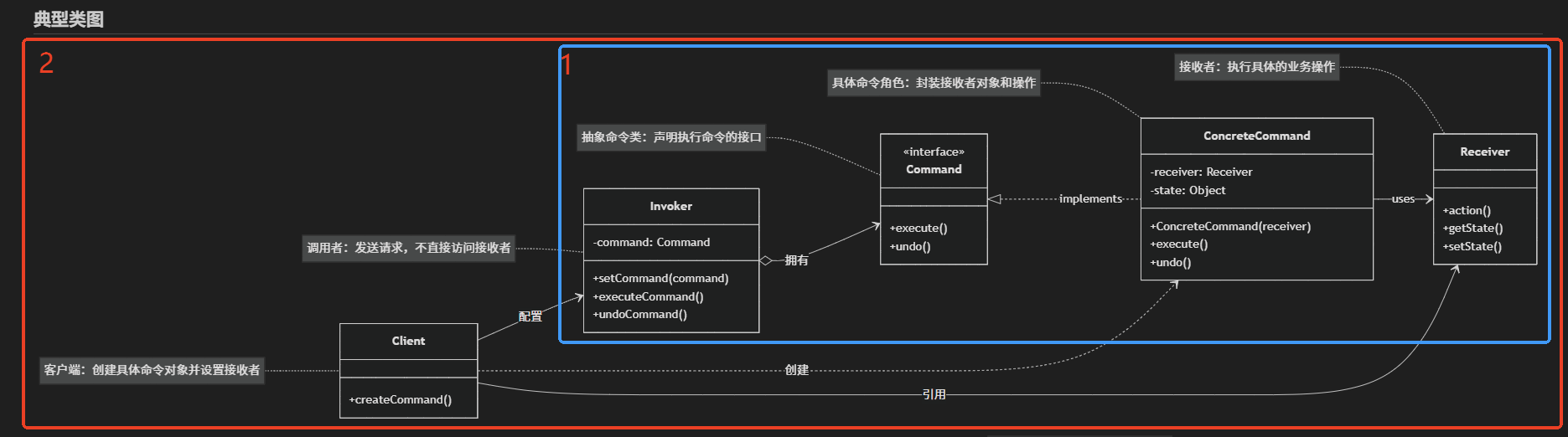 在经典的命令模式中,具体命令对象(Concrete Command)通常会持有一个接收者(Receiver)的引用,并在 `execute` 方法中调用接收者的方法来完成实际工作(`receiver.action()`)。而静态命令则将业务逻辑直接实现在命令对象自己的 `execute` 方法中,不再需要一个独立的接收者角色。