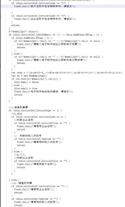 以下代码中,将所有字段的校验规则都堆叠在一起,如果想查看某个字段的校验规则,则需要将所有的判断都看一遍