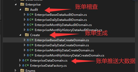 定义了账单生成抽象类EnterpriseBaseDataCreateDomain以及账单稽查抽象类EnterpriseBaseDataAuditDomain。在抽象类中定义了数据处理的骨架算法 CreateEnterpriseData() 和 AuditEnterpriseData(),子类只需要实现具体的业务逻辑 CreateSingleEnterpriseData() 和AuditSingleEnterpriseData()