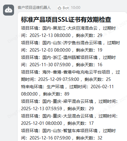 二是 SSL 证书过期时间,之前曾因某项目证书过期导致用户无法访问,这次我们通过监控配置,不需要访问网站就可以看到证书的过期时间,而且当证书剩余有效期过短时,系统会每天发送一次钉钉提醒。