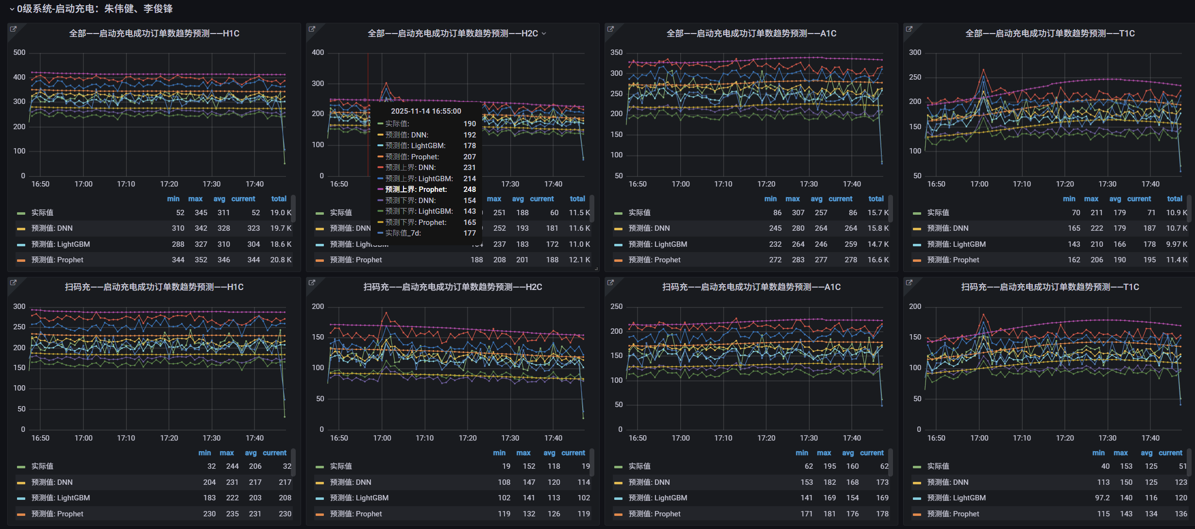 我们意识到,仅当业务流量已经暴跌时才报警,损失已然发生。为此,我们为核心业务链路引入了智能预测模型。同时与业务团队的深入沟通交流,共同识别了系统中的核心业务链路,例如“用户从登录到完成充电”的完整流程。结合InfluxDB的连续查询功能,并利用DNN、Prophet、LightGBM等模型进行时间序列预测,生成未来一段时间内业务流量的合理区间带,以此来提前感知业务流量的异常衰减或骤增。