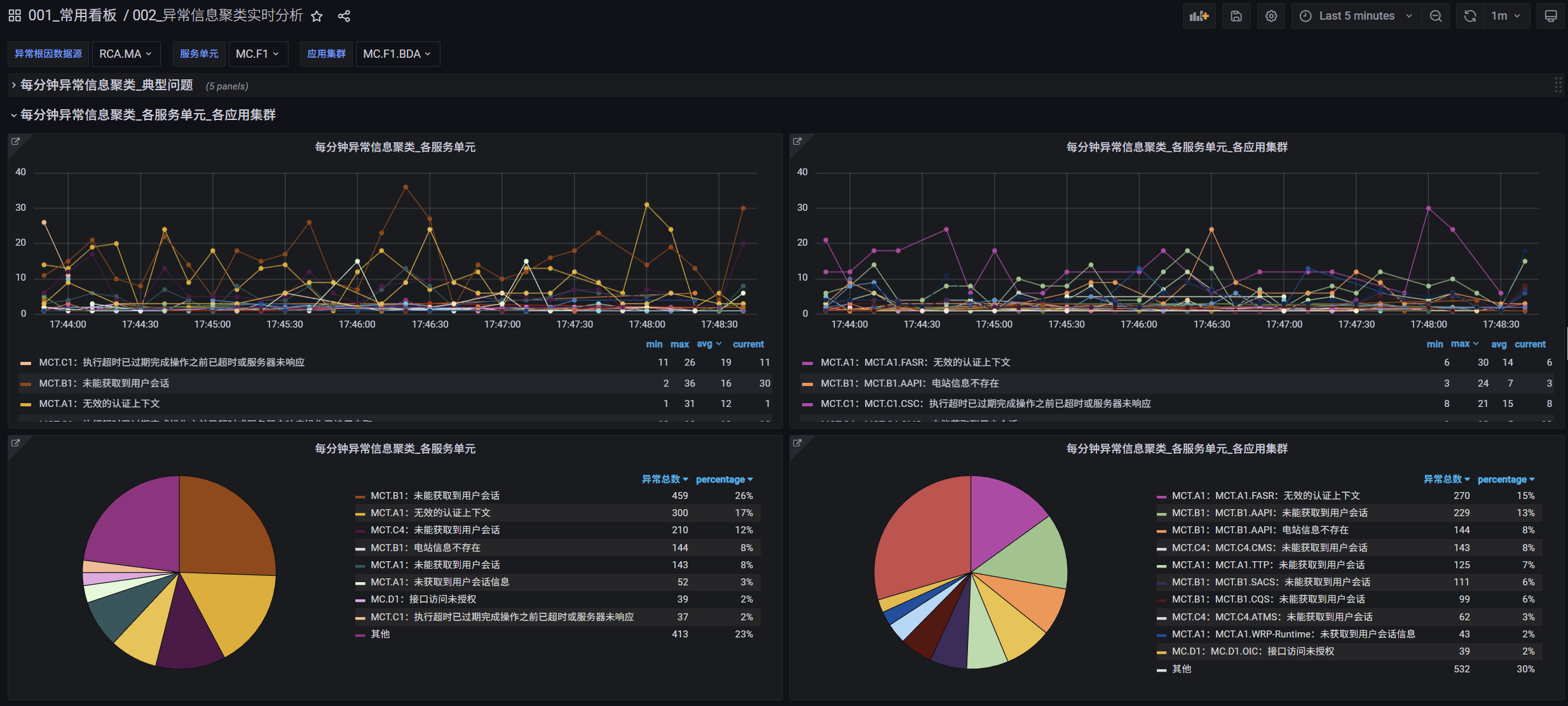 在应用日志中,各种错误和异常司空见惯,如何从成千上万条日志信息中提取归纳出有用的关键点,是分析判断业务异常的关键。我们按照数据中心、服务单元、应用集群等多种维度对上报的异常信息进行了聚类分析,写入到InfluxDB,并由Grafana进行展示,这样即可将我们需要寻找的关键信息在背景噪音中分离出来,能够指引我们迅速发现问题,避免后续的服务雪崩。