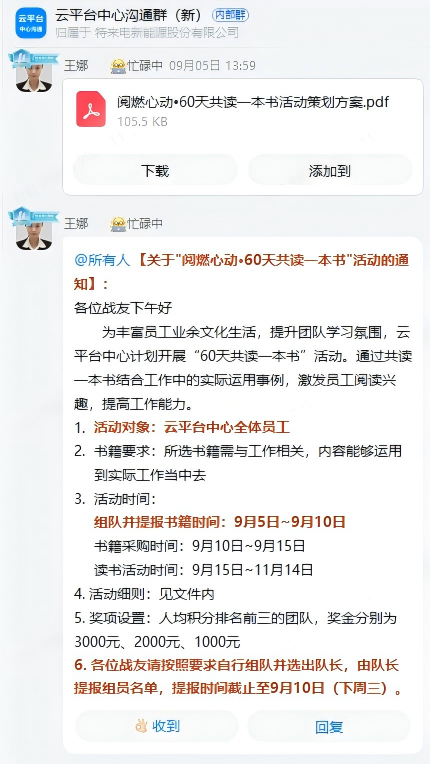 2025年9月5日,看到“云平台中心沟通群”中发布了“关于"阅燃心动•60天共读一本书"活动的通知”: