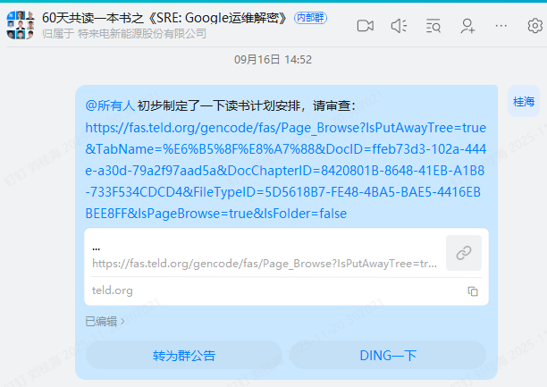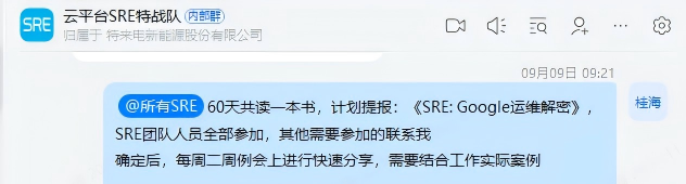SRE人员比较多,为了能在规定时间内完成《SRE: Google运维解密》的阅读,我们组建了一个”60天共读一本书之《SRE: Google运维解密》”钉钉群: