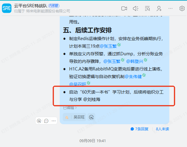 周例会问题分析及故障复盘时,大家都提到这章的启发——以前我们只说“解决了什么”,现在会主动复盘“哪步假设错了”“哪个工具帮我们缩短了排查时间”。原来SRE的故障排查不只是靠“直觉”,而是用系统化方法把Grafana、全链路监控这些工具串成闭环,这大概就是共读最实在的收获吧。