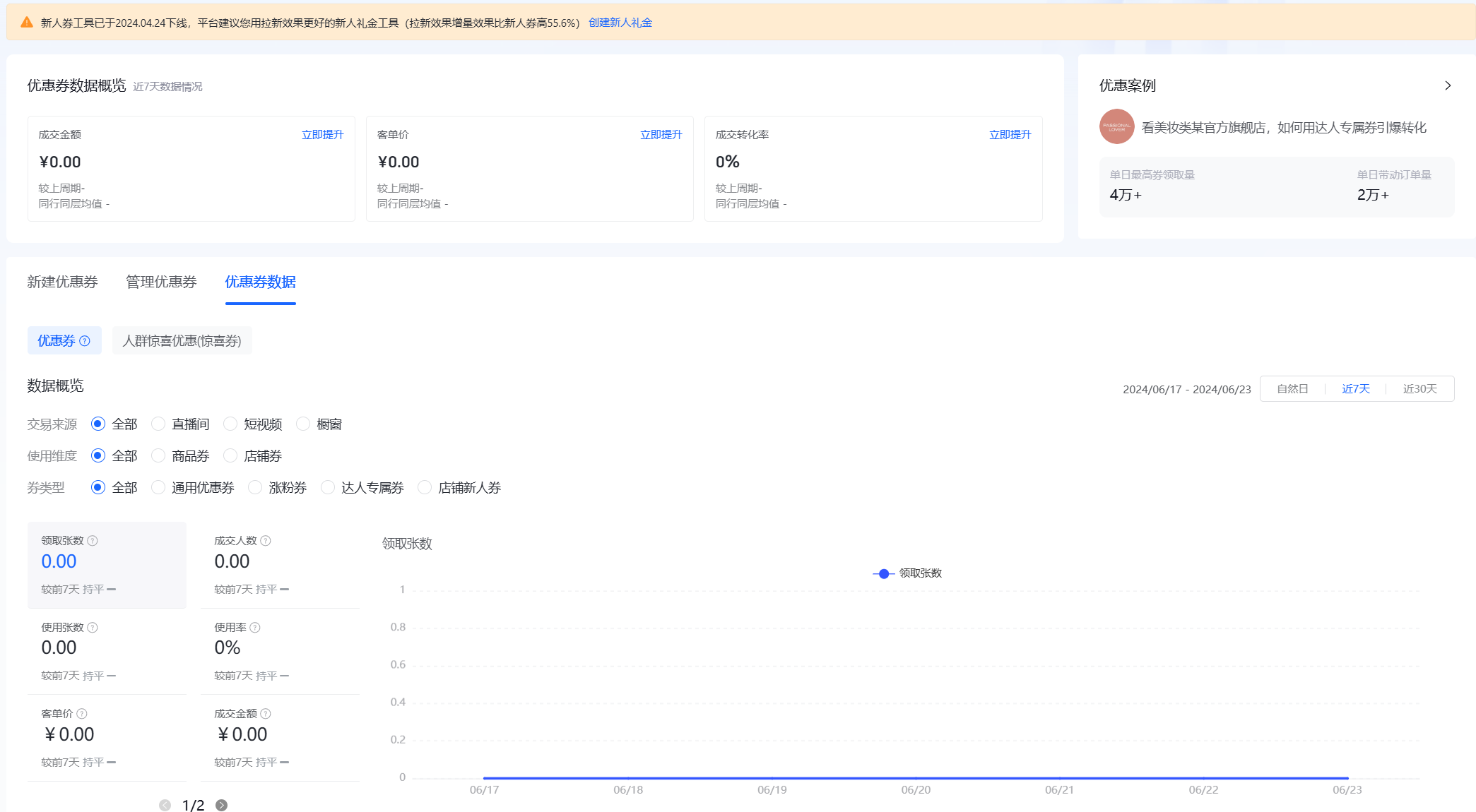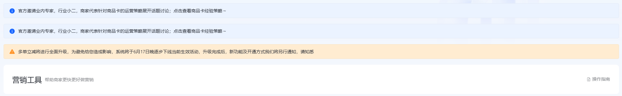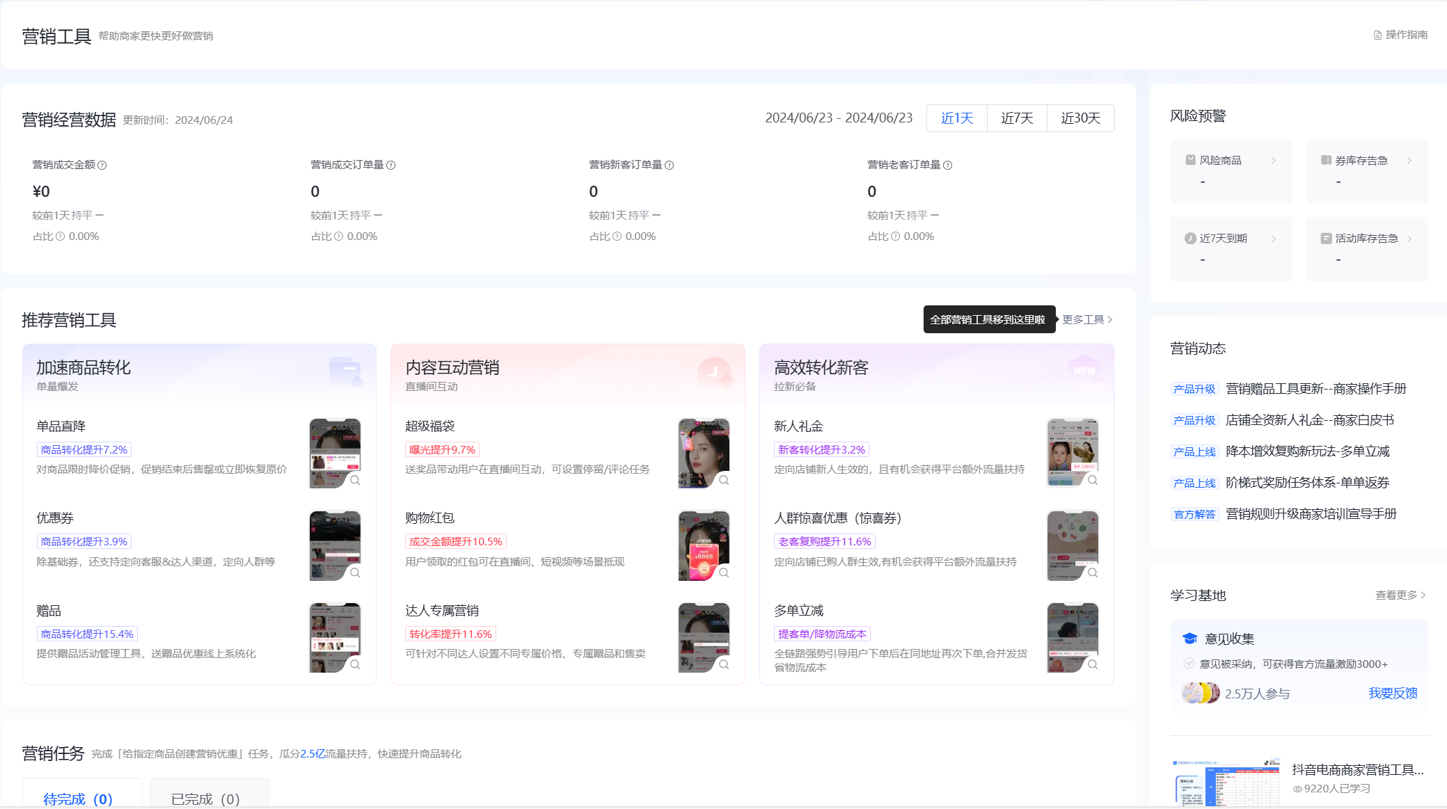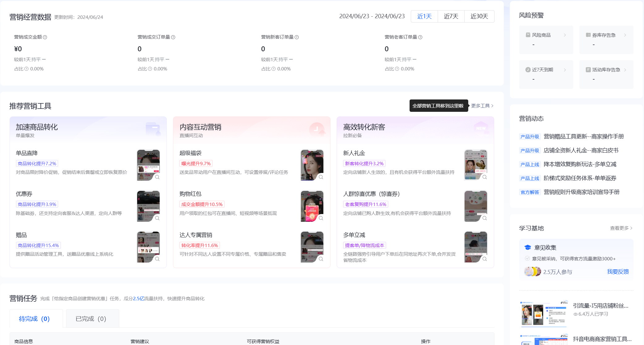 以抖店的“营销中心”为例,该功能中心化设计应该集成了各种营销工具和数据分析功能,允许用户在一个界面上管理促销活动、跟踪营销成效,并获取实时的业务诊断信息。用户可以在营销中心看到最新的销售数据、活动效果和预警信息,同时也能够访问到相关的帮助文档和最佳实践指南。