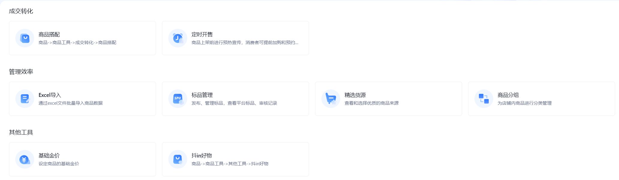 工具类功能是为了解决特定问题而设计的,可能包含一组工具,如商品工具、售后小助手等,通常以“工具”作为后缀命名。