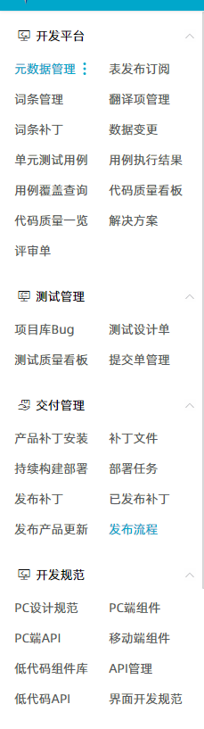 研发效能平台和研发交付平台的新菜单风格,个人有些不太习惯,字太多太密集,区分度不大,部分菜单还改名字了(应该是为了适应宽度吧),刚找一个功能找了半天,看起来感觉很累,建议增加个人设置,使用新风格还是老风格