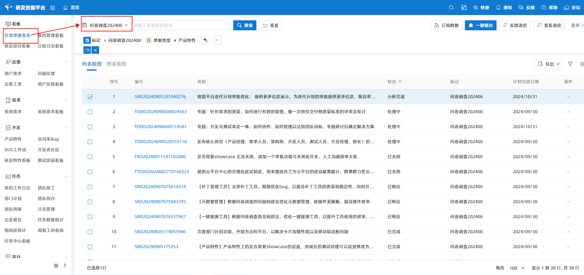 各位战友,“为基层员工减负,创造更多价值” 问卷调查落地方案全部录入到了系统,跟进路径:研发效能平台->看板->任意单据查询->问卷调查202408查询方案。