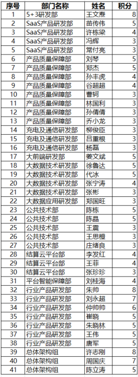 各位战友: 大家好。我们秉承“价值创造”的研发文化,根据每位战友的工作表现与贡献度,由云平台管理层集体综合评价,评选出10月份的“价值创造者”。并根据贡献给予相应的积分激励。 10月份“价值创造者”名单及积分激励情况如下:
