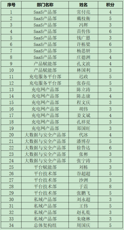 各位战友: 大家好。我们秉承“价值创造”的研发文化,根据每位战友的工作表现与贡献度,由云平台管理层集体综合评价,评选出3月份的“价值创造者”。并根据贡献给予相应的积分激励。 3月份“价值创造者”名单及积分激励情况如下: